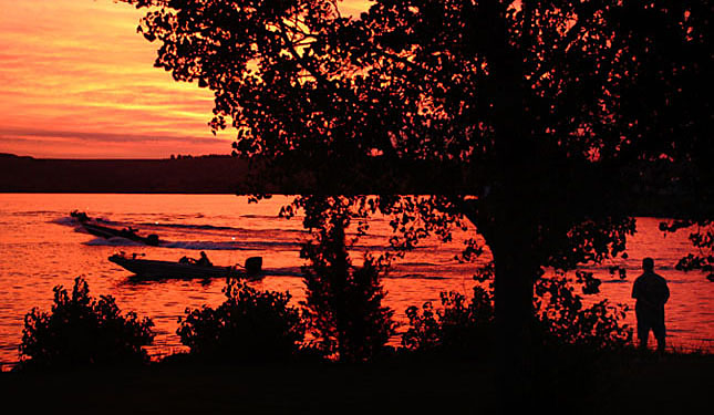 An official with the Hays Bass Anglers Association watches boats take off as the morning sunrise paints the sky orange during the Big Bass Challenge on Saturday, August 6, 2011, at Lake Wilson.