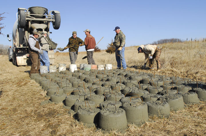 Members of the Hays Bass Anglers Association helped make more than 300 concrete anchors on 2-18-12 for a habitat project at Sheridan State Fishing Lake located east of Hoxie. The anchors were made by the club to help fisheries biologists for the Kansas Department of WIldlife Parks & Tourism sink cedar trees for to improve the fisheries habitat at the lake. Pictured from (L-R); HBAA members Bob Hoffman, Bob Stewart, Nate Brown, Dave Spalsbury, KDWP&T fisheries biologist, and HBAA members Darrel VonFeldt and Keith Harmoney.